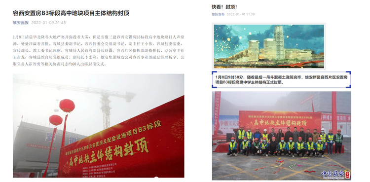 此外,人民雄安網(wǎng)《雄安容西片區(qū)高中封頂、未來可容納1920名學(xué)生》、新浪網(wǎng)《雄安新區(qū)容西片區(qū)B3標(biāo)段高級中學(xué)主體結(jié)構(gòu)封頂》、中國雄安官網(wǎng)《看建雄安丨容西片區(qū)B3標(biāo)段高級中學(xué)主體結(jié)構(gòu)封頂》以及河北日報報業(yè)集團(tuán)、雄安發(fā)布、澎湃新聞等多家媒體官網(wǎng)、公眾號、微博客戶端對此次封頂儀式進(jìn)行了宣傳報道,贏得點(diǎn)贊紛紛。