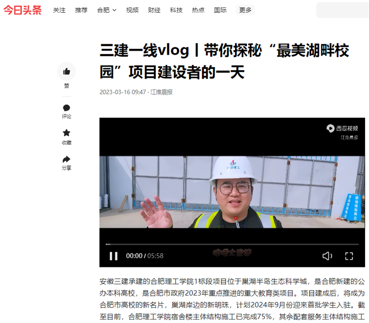 近日,學(xué)習(xí)強(qiáng)國、今日頭條、合肥晚報等主流媒體聚焦公司一線vlog,該視頻以較為新穎的vlog形式,聚焦項目一線管理人員工作生活動態(tài),展現(xiàn)項目建設(shè)成果,受到廣泛關(guān)注。